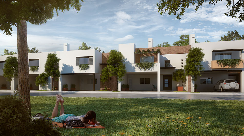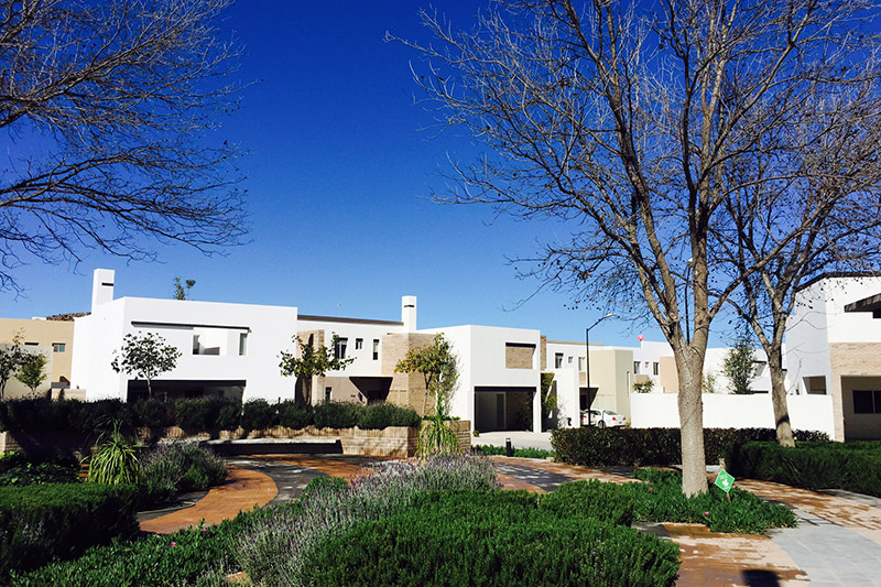 Desarrollo residencial con amplios jardines y áreas de recreación. Los proyectos, también del Arq. Rafael Adame Doria, implementan arquitectura mexicana contemporánea con soluciones de diseño e ingeniería optimizadas para cada lote.