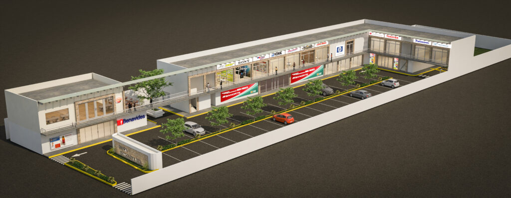 Proyecto de plaza comercial de uso mixto, diseñado para albergar locales comerciales y servicios financieros. La propuesta arquitectónica integra una imagen contemporánea con materiales de bajo mantenimiento, circulación peatonal elevada y áreas de estacionamiento estratégicamente distribuidas.